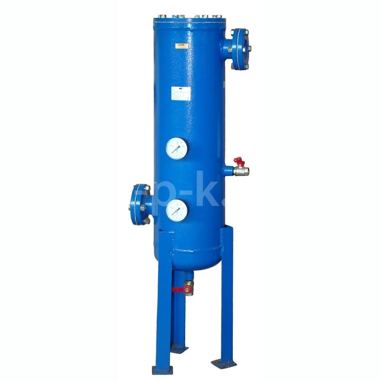 Сжатый воздух поступает через патрубок «вход» в нижнюю часть корпуса фильтра, где происходит механическое отделение (сепарация) наиболее крупных капель жидкости и твёрдых частиц методом инерционного сепарирования центробежным способом. Отделившаяся жидкость (водо-масляная эмульсия) стекает по стенкам корпуса фильтра в днище корпуса.