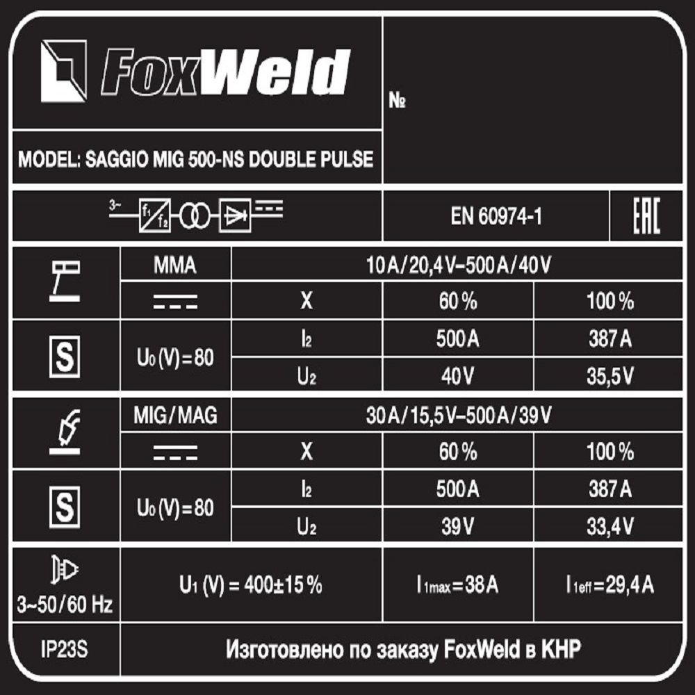 Сварочные инверторы MIG-MAG Fox Weld SAGGIO MIG 500-NS DOUBLE PULSE с аттестацией НАКС: характеристики